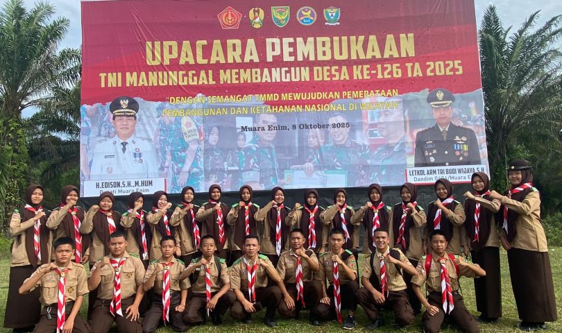 Muara Enim (Kemenag Sumsel)–Dalam rangka menyemarakkan pembukaan TNI Manunggal Membangun Desa (TMMD) ke-126 Tahun 2025, Rabu 8 Oktober 2025 anggota Pramuka Madrasah Aliyah Negeri 1 Muara Enim Gudep 04/07/113 dan 04/07/114 ikut hadir dan turut berpartisipasi dalam pelaksanaan upacara yang digelar di Lapangan Desa Harapan Jaya Kecamatan Muara Enim Kabupaten Muara Enim.