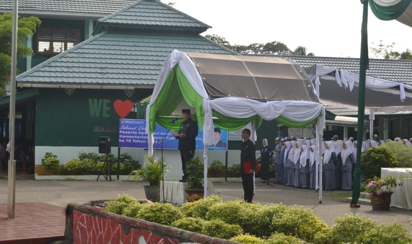 “hadirin, peserta apel yang berbahagia. Sebagaimana tahun sebelumnya, sebagai bentuk apresiasi atas pengabdian kepada negara, kementerian agama tahun ini kembali mengajukan kepada bapak presiden untuk memberikan penghargaan satyalancana karya satya kepada 10.198 pegawai negeri sipil kementerian agama. Permohonan itu telah dikabulkan bapak presiden. Dan, pada hari amal bakti ke-78 ini, atas nama bapak presiden, diberikan penghargaan satyalancana karya satya 30 tahun kepada 1.071 (seribu tujuh puluh satu) orang, 20 tahun kepada 2.810 (dua ribu delapan ratus sepuluh) orang, dan 10 tahun kepada 6.317 (enam ribu, tiga ratus, tujuh belas) orang pegawai negeri sipil kementerian agama.saya ucapkan selamat kepada para penerima penghargaan. Semoga penghargaan tersebut semakin meningkatkan kinerja asn kementerian agama dan menambah kebanggaan, sebagai bagian dari korps kementerian agama”.