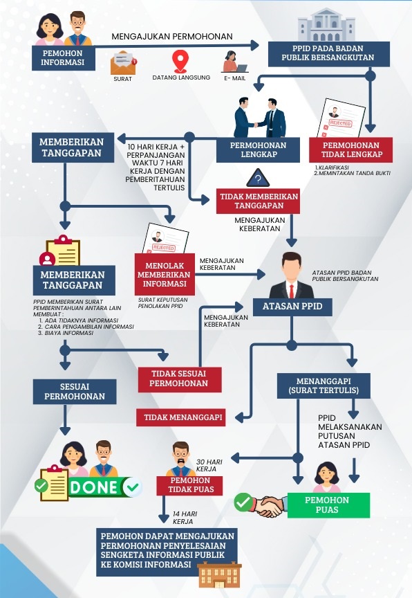 - Mengisi formulir permohonan yang disediakan. Formulir biasanya berisi informasi mengenai identitas pemohon (nama, alamat, nomor telepon), jenis informasi yang dimohon, alasan pengajuan, dan lainnya.