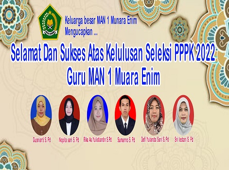 Sebanyak enam GBPNS (Guru Bukan Pegawai Negeri Sipil) Madrasah Aliyah Negeri 1 Muara Enim berhasil lulus dalam seleksi ASN PPPK tambahan tahun 2022. Perjuangan mereka untuk mengubah statusnya menjadi Aparatur Sipil Negara Pegawai Pemerintah dengan Perjanjian Kerja (ASN PPPK) berbuah manis. Ucapan selamat disampaikan oleh guru dan karyawan Madrasah Aliyah Negeri 1 Muara Enim. Terkhusus ucapan selamat juga disampaikan oleh Kepala Madrasah Aliyah Negeri 1 Muara Enim Abuddarda. Selasa (12/9)