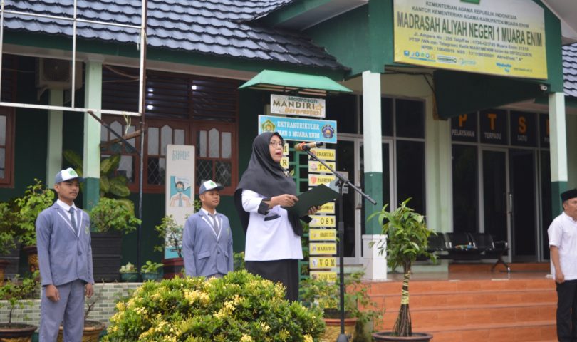 Sri Astuti wakil kepala bidang bidang Akademik saat menjadi pembina upacara pada hari Senin (15/1) memperkenalkan kepada Kelas Digital kepada seluruh siswa dari kelas X sampai dengan kelas XII Madrasah Aliyah Negeri 1 muara Enim yang mengikuti upacara penaiakan bendera merah putih di lapangan Madrasah Aliyah Negeri 1 muara.
