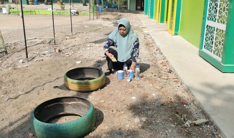 Ban-ban yang tidak lagi digunakan dan dijadikan pot-pot bunga oleh pembina Adiwiyata untuk vertical garden dan bisa digunakan untuk hidroponik maupun aquaponik, bahkan ada yang memanfaatkan sebagai tempat untuk menanam sayuran organik. “Pot dari sampah ban bekas juga bisa anternatif mensiati taman madrasah yang sempit,” ungkap Hj.Raihanah.
